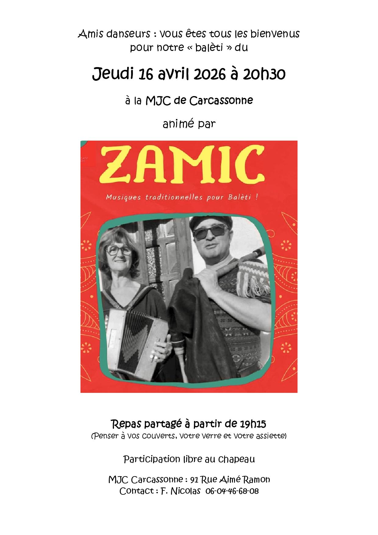 L’atelier Danses Traditionnelles vous invite à son balèti, animé par le groupe Zamic. Que vous soyez danseur aguerri ou simple curieux, tout le monde est le bienvenu !