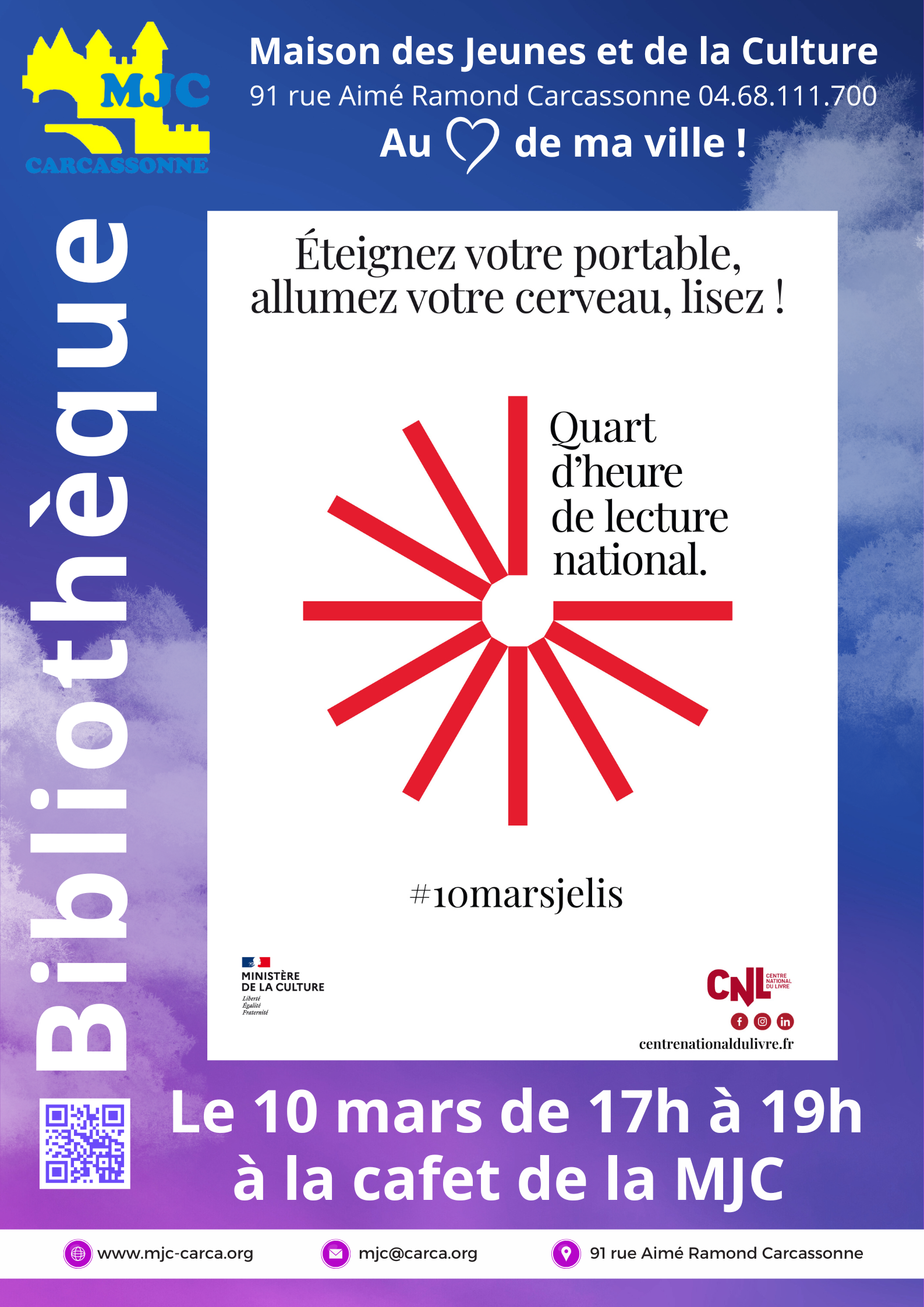 Si j’ai déjà choisi un texte de fiction à lire (roman, nouvelle, théâtre, poésie), je m’inscris à l’adresse mail suivante et je lirai entre 17h et 18h : BibMjcCarca@gmail.com